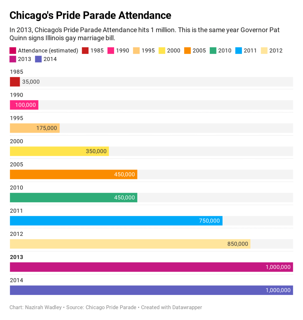 However, within 2013, Governor Pat Quinn signs Illinois bill of same sex marriage. Illinois became the 16th state to allow same sex marriage. Gov. Pat Quinn gives a speech about liberty and recites the beginning of Abraham Lincoln’s Gettysburg Address to emphasize that this primary piece serves purpose to ‘All men are created equal’ and its importance of liberation for the LGBTQ community. Below is a data piece of the Chicago Pride Parade attendance from 1990 to 2014.